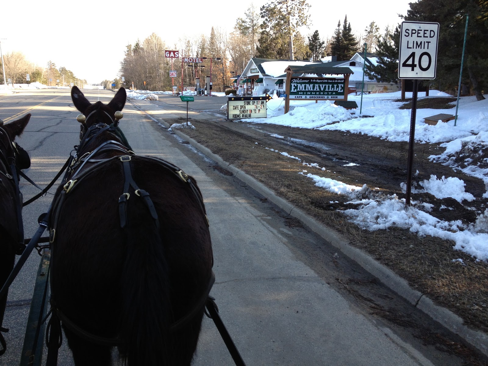 We met several people along trail the today. A jogger conversed with us as we were both moving, at one point during our conversation he started jogging backwards. He inquired where we are headed. We let him know we are headed to Joice, IA. He said he used to live near Forestville, IA. Other passerbys shared treats for us and for the mules.Our contact in this area was a long-time nursing friend that agreed to let us camp in her yard, but with our quick-footed mules we arrived at her home by noon. Wanting to make use of the rest of the day, we decided headed down Hubbard 91 and went into Lake George. We told our story and the local community came to our aid. A little cafe in Lake George gave us lunch and helped arrange our overnight accommodations. They first arranged for us to sleep in the Senior Citizen Center until they realized that a bug bomb had recently been released and wasn't ideal for sleeping. It was still early in the day so we continued traveling. Shortly after we left Lake George, we received a call and learned that our new friends in Lake George made arrangements for us to stay at a motel in Emmaville. The mules have been wanting to trot much of our trip, but were happy to walk along the road for the 16 miles from Lake George to Emmaville.